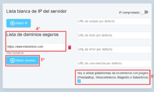 - Verifica que el dominio desde el cual se lanza la pasarela de pago esté en la “Lista de dominios seguros” mostrada.