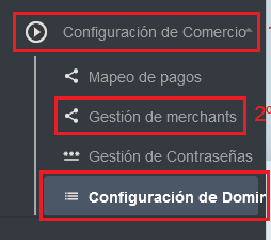 - Si la configuración es para un sub comercio, accede al mismo pulsando en “Configuración de Comercio” > “Gestión de Merchants” y selecciona el comercio que necesites.